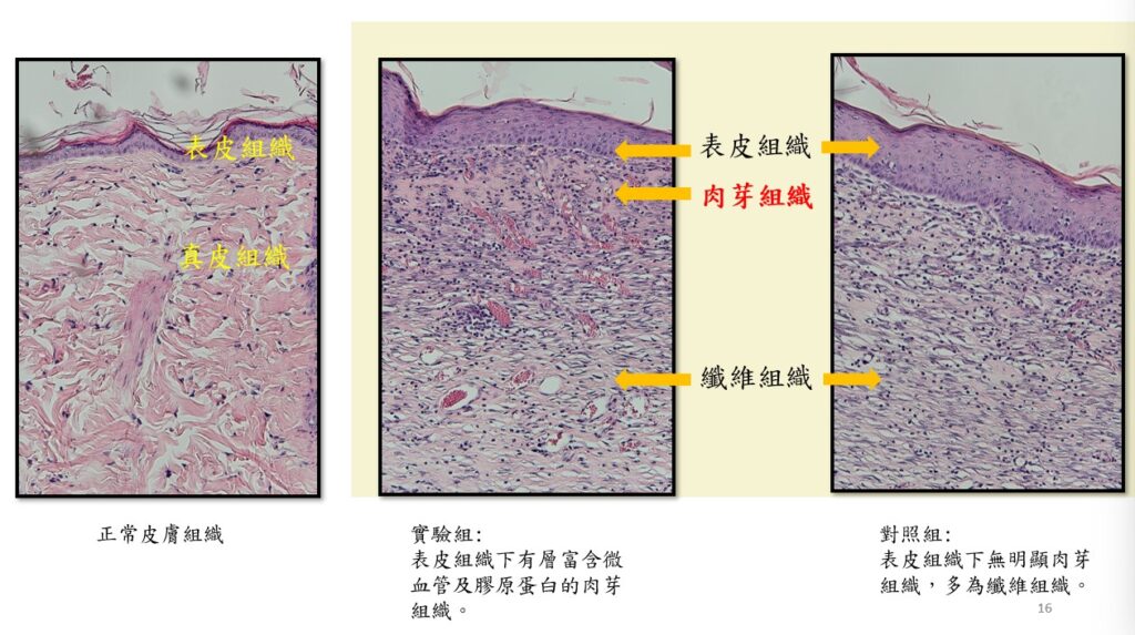 「優偌肽」血小板裂解液中含有高濃度的不同生長因子,例如:血小板衍生生長因子、乙型轉化生長因子、角質細胞生長因子、血管內皮生長因子等,都是傷口修復過程需要重要生長因子。圖二中可觀察到,使用「優偌肽」實驗組產生新生血管及一層肉芽組織,與對照組相比,更快速的進入增生期,幫助傷口癒合。