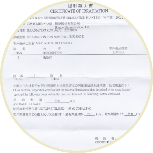 輻射 Gamma 滅菌(中國生化無菌試驗報告編號:MID-2304-005R)